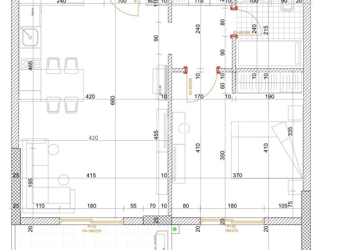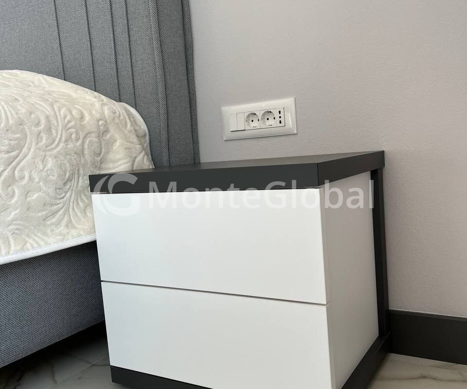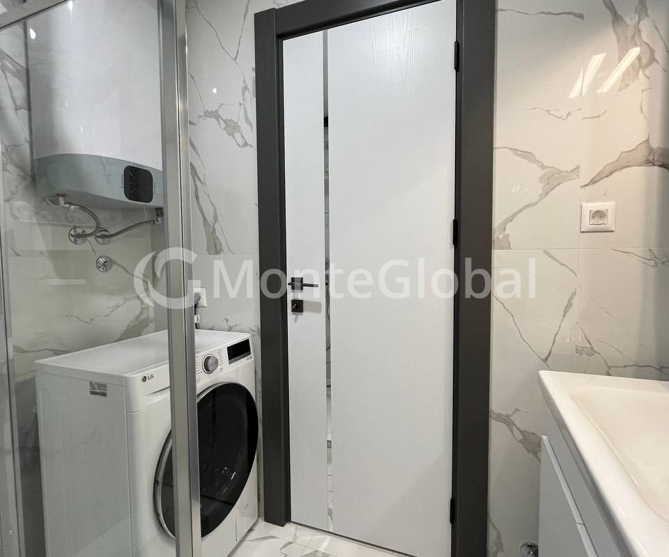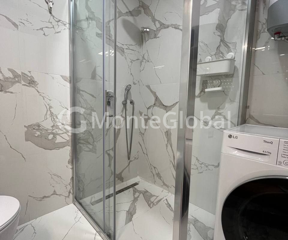 The kitchen is equipped with a full set of built-in Bosch appliances. TV QLED 55“. Washer-dryer. Split systems in every room, heated floors in the bathroom and part of the living room, panoramic windows.