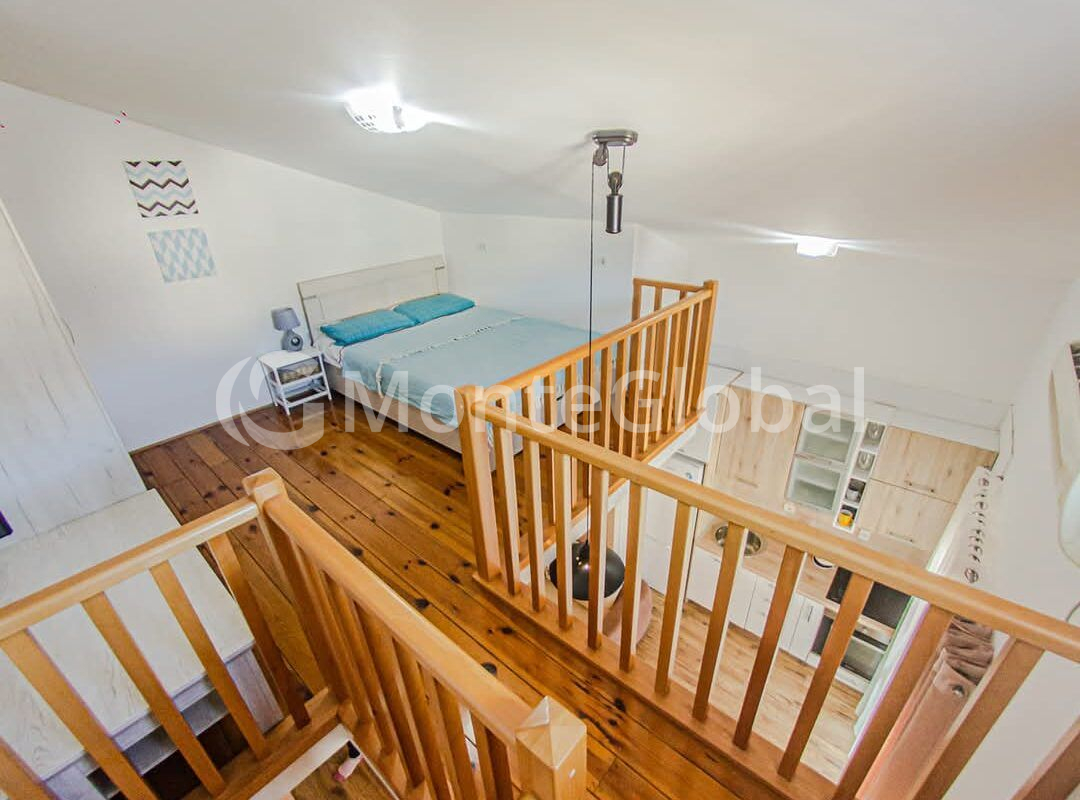 On the first level there is a combined living room with a kitchen area, a bedroom, a bathroom and a glazed terrace, which was converted into an additional room. The second level includes another bedroom.