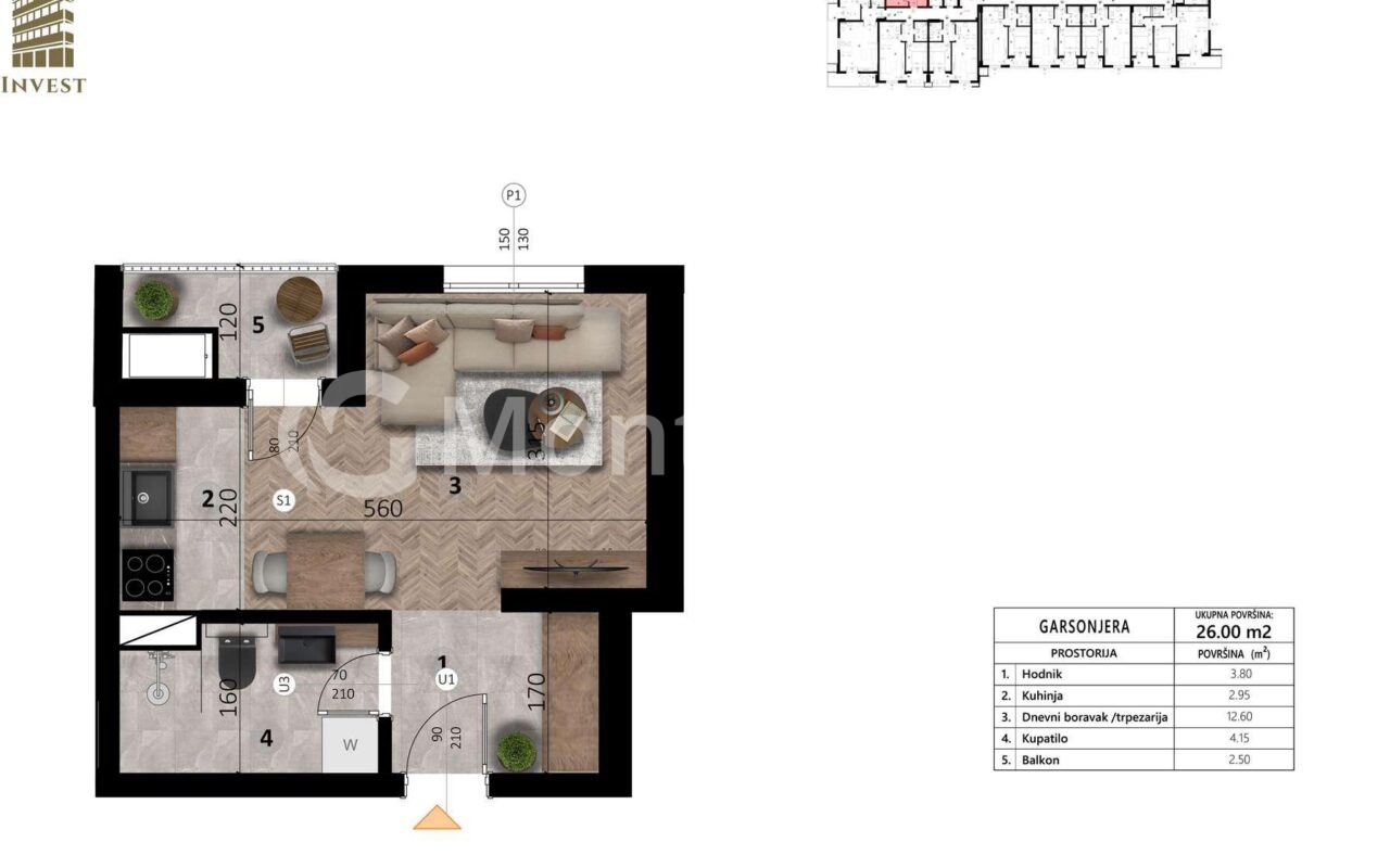Studio area 26m2