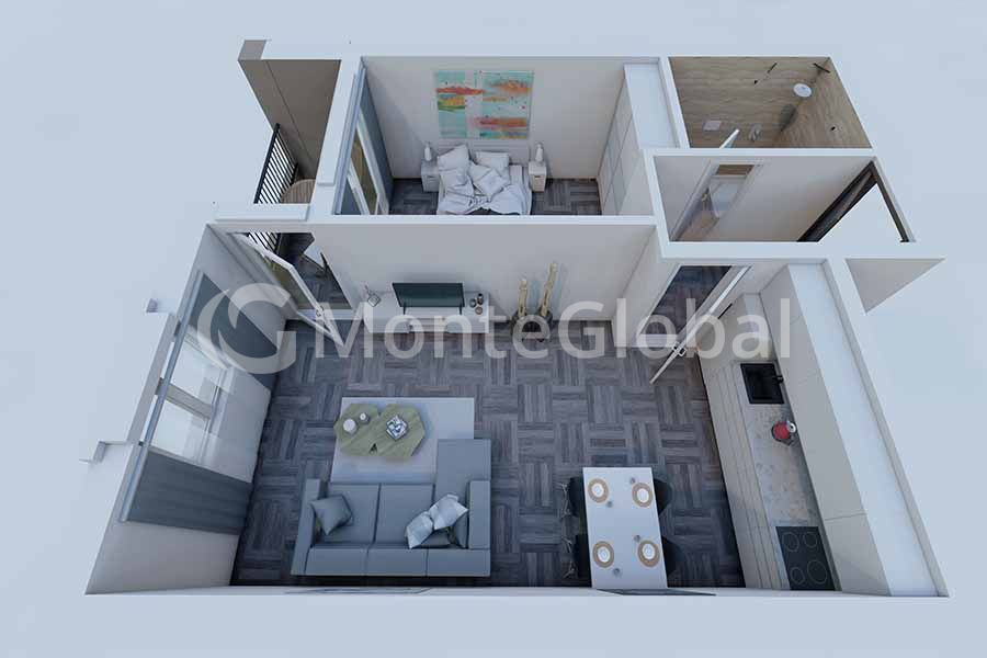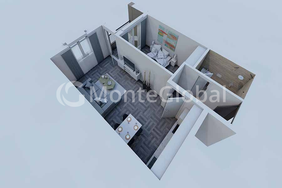 The structure of the apartment is living room, kitchen, one bedroom, bathroom and balcony