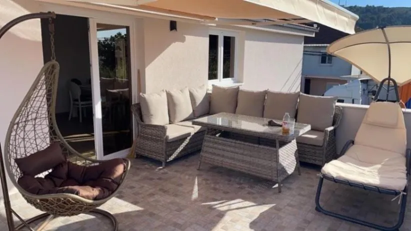 The second floor consists of two bedrooms, a bathroom and a spacious living room with kitchen, which opens onto a terrace with beautiful views of the mountains and the old town. It has its own gym.