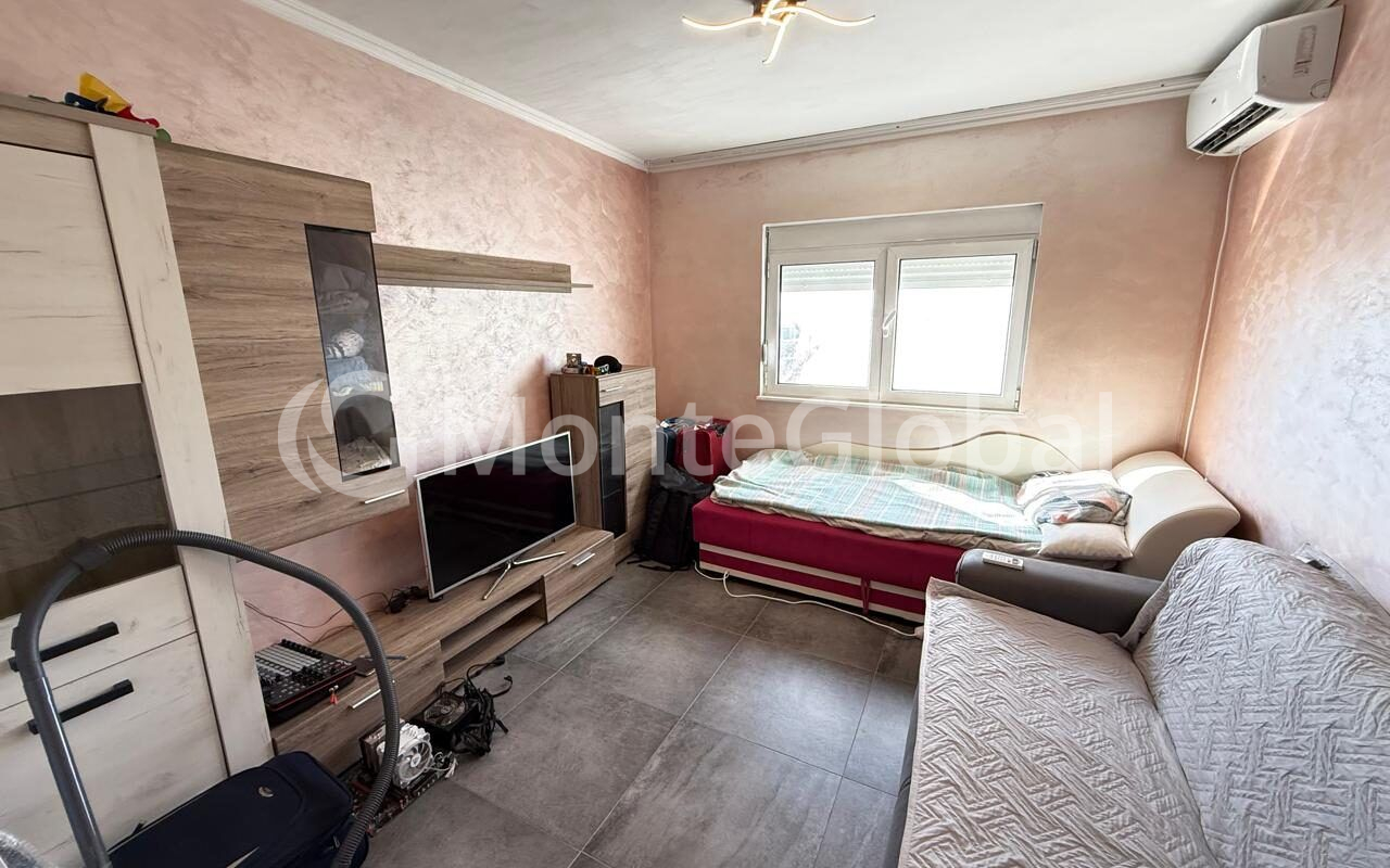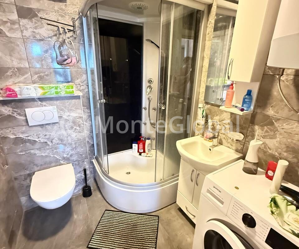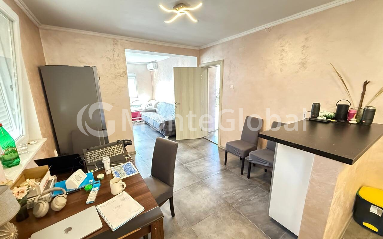 Ground floor: a self-contained studio apartment with high-quality renovations, including a living room with a kitchen area, a bedroom, and a hallway. Additionally, there is a storage room/workshop and two parking spaces, with another storage room underneath. The second floor features a spacious living room with a kitchenette, two bedrooms, a bathroom, a hallway, and a large terrace with panoramic views of the sea and the city of Bar. This floor also features a separate room with its own entrance, which could be used as an additional bedroom.