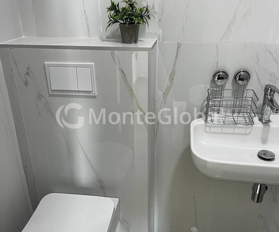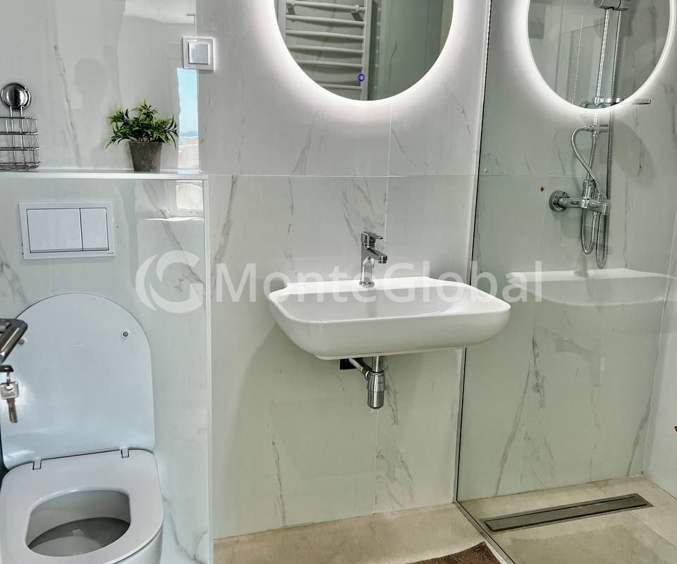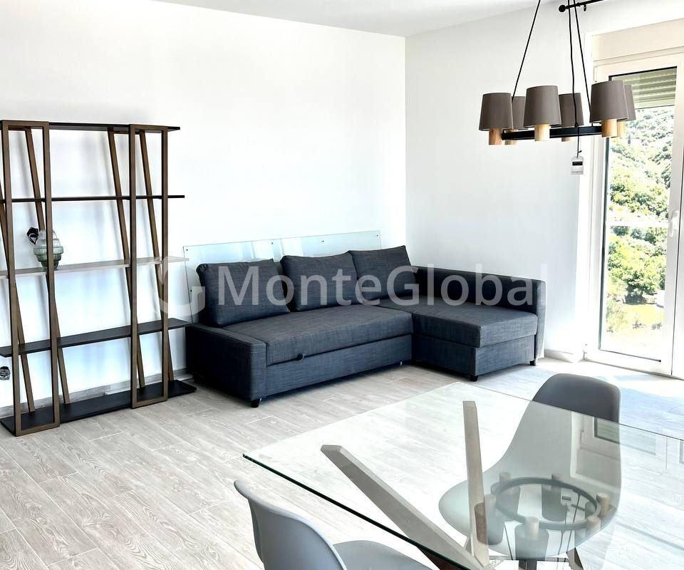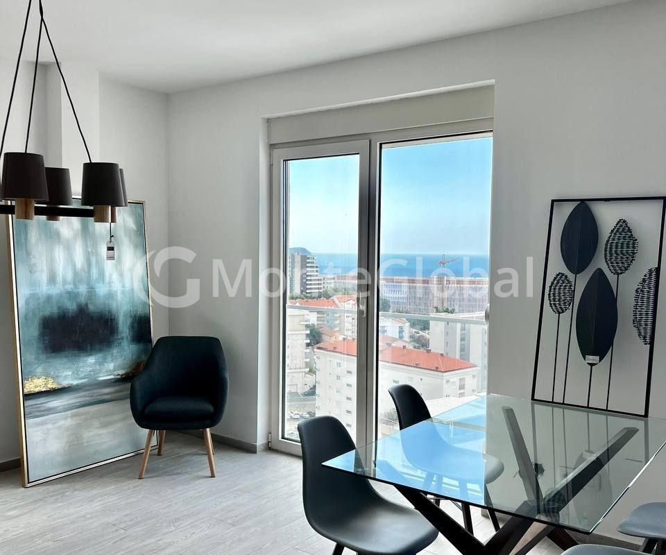 Bright apartment after renovation and furnishing with floor-to-ceiling windows in a modern residential complex with a living room and kitchen area, 2 bedrooms, 2 bathrooms, a terrace overlooking the sea, mountains and Becici.