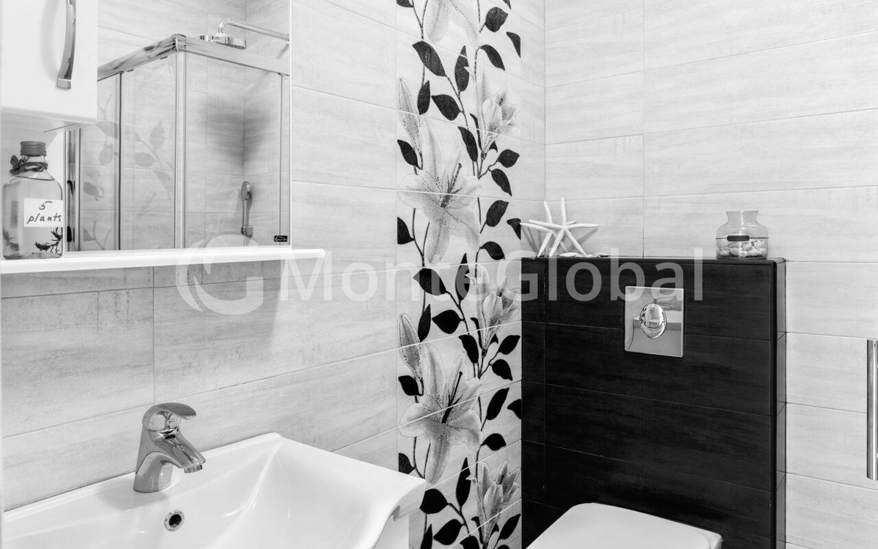 From the living room there is access to a large terrace (12 m2) overlooking the sea. The first bedroom has a sea view, the second bedroom has a mountain view.
