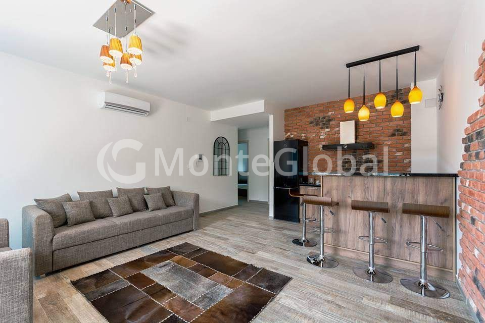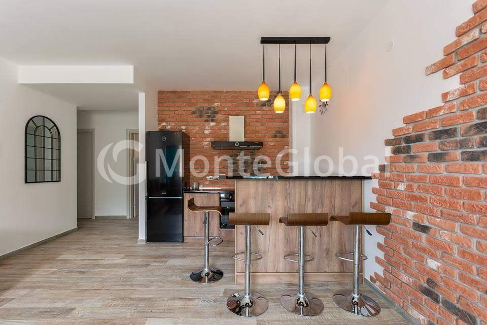 For sale a comfortable apartment in a residential complex with views of the sea and mountains, with designer renovation, for lovers of a brutal and cozy atmosphere in Becici