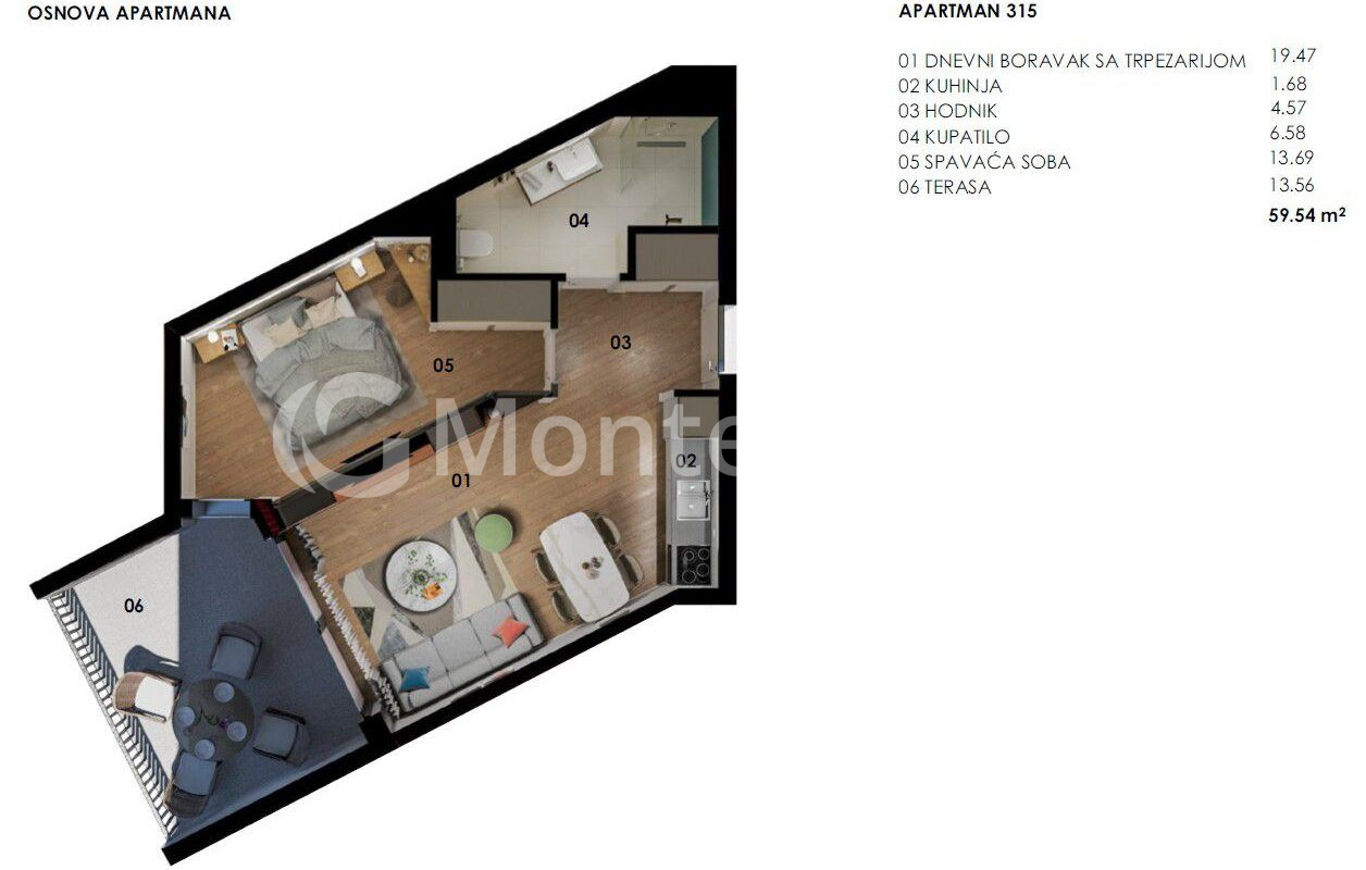 Apartment size: 59.54 m² + terrace 13.5 m²