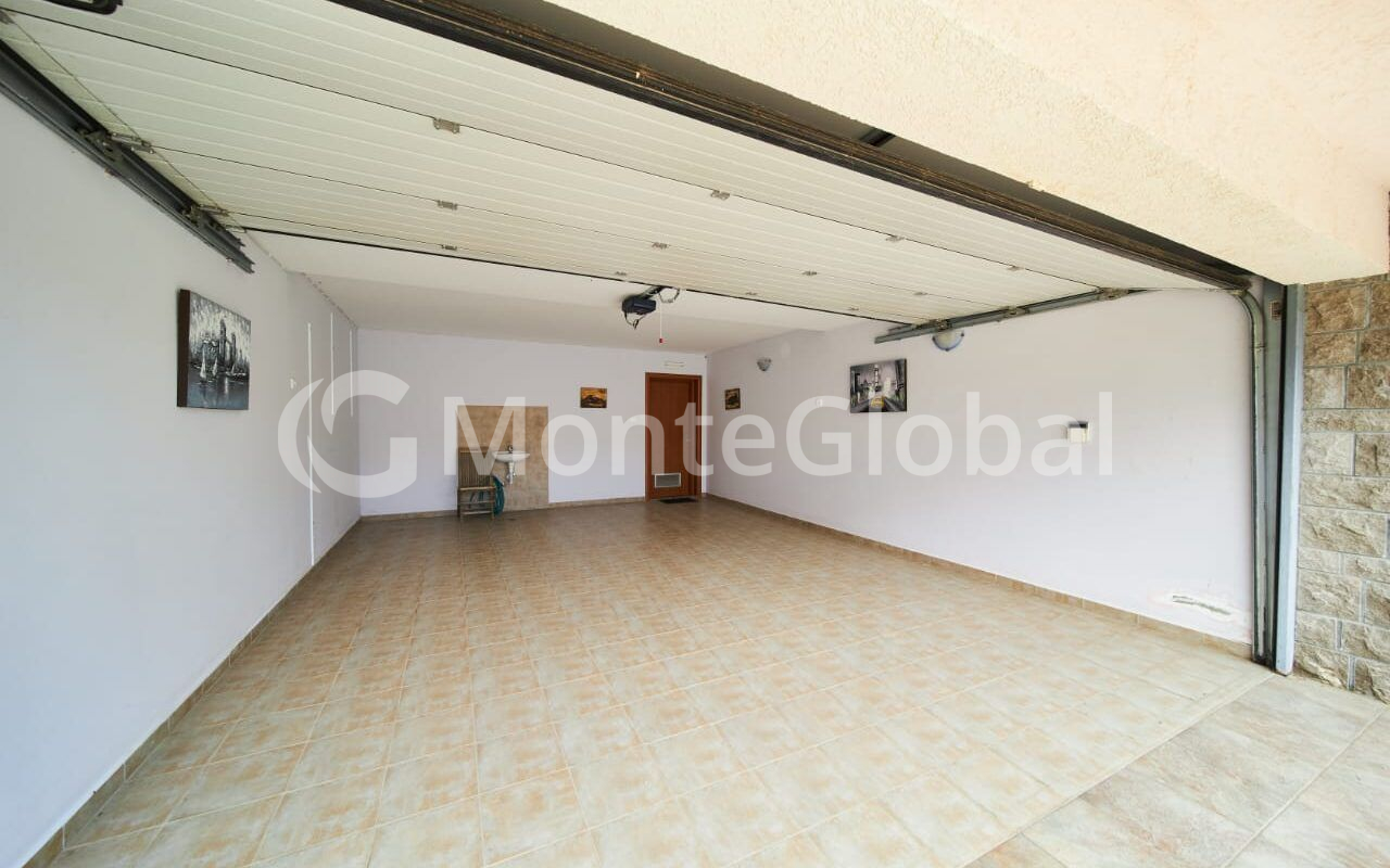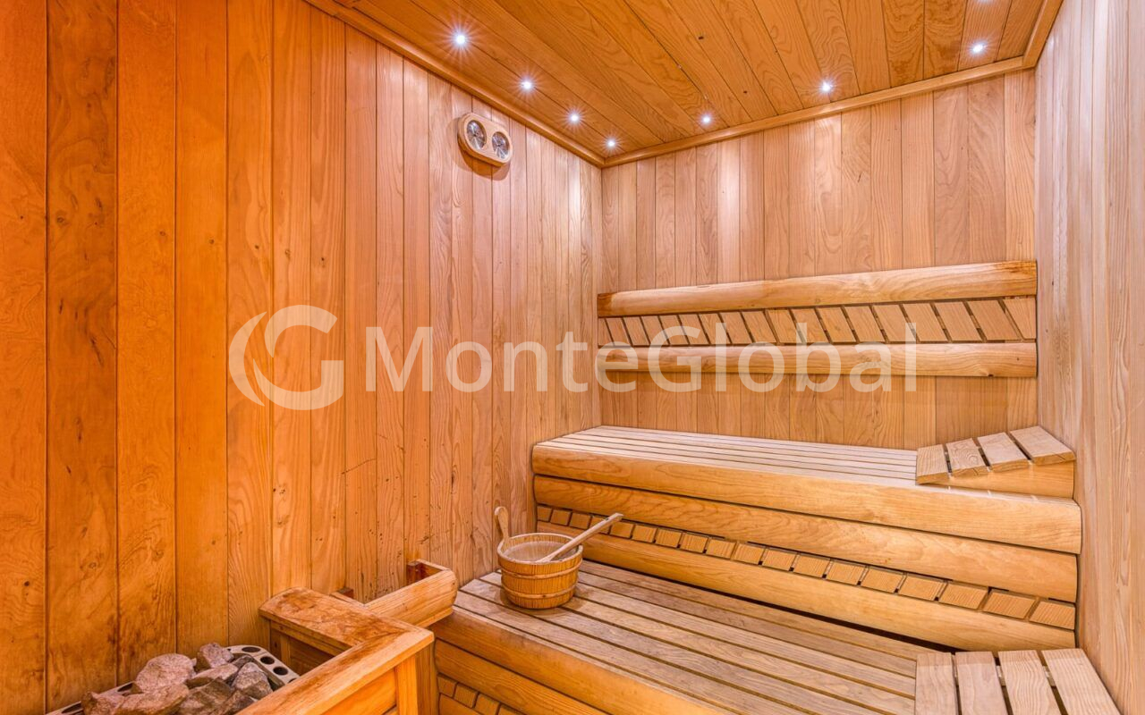 The ground floor features a spacious living room, open-plan kitchen and dining area, complete with a fireplace. There is also a guest toilet and a sauna with direct access to the pool.
