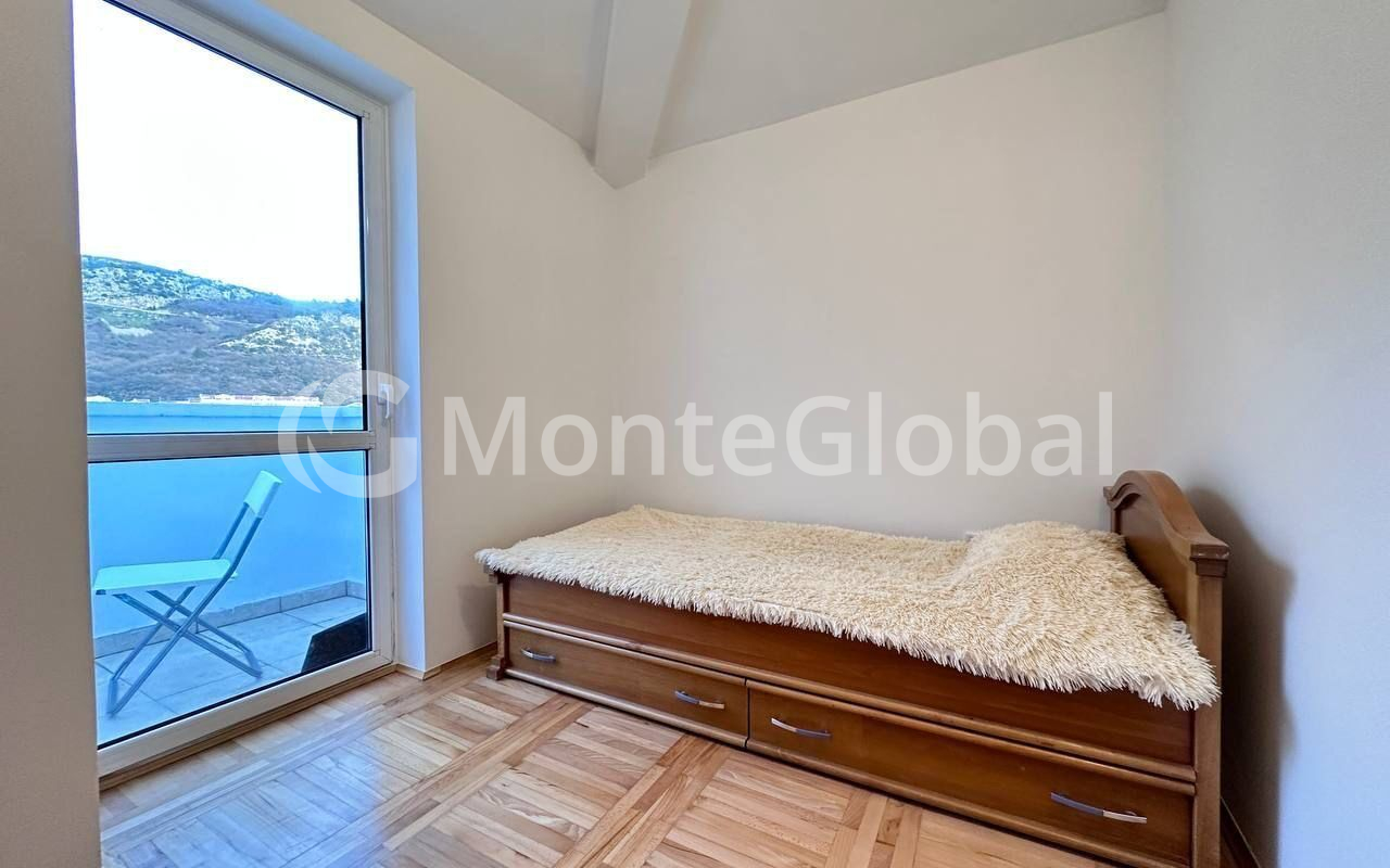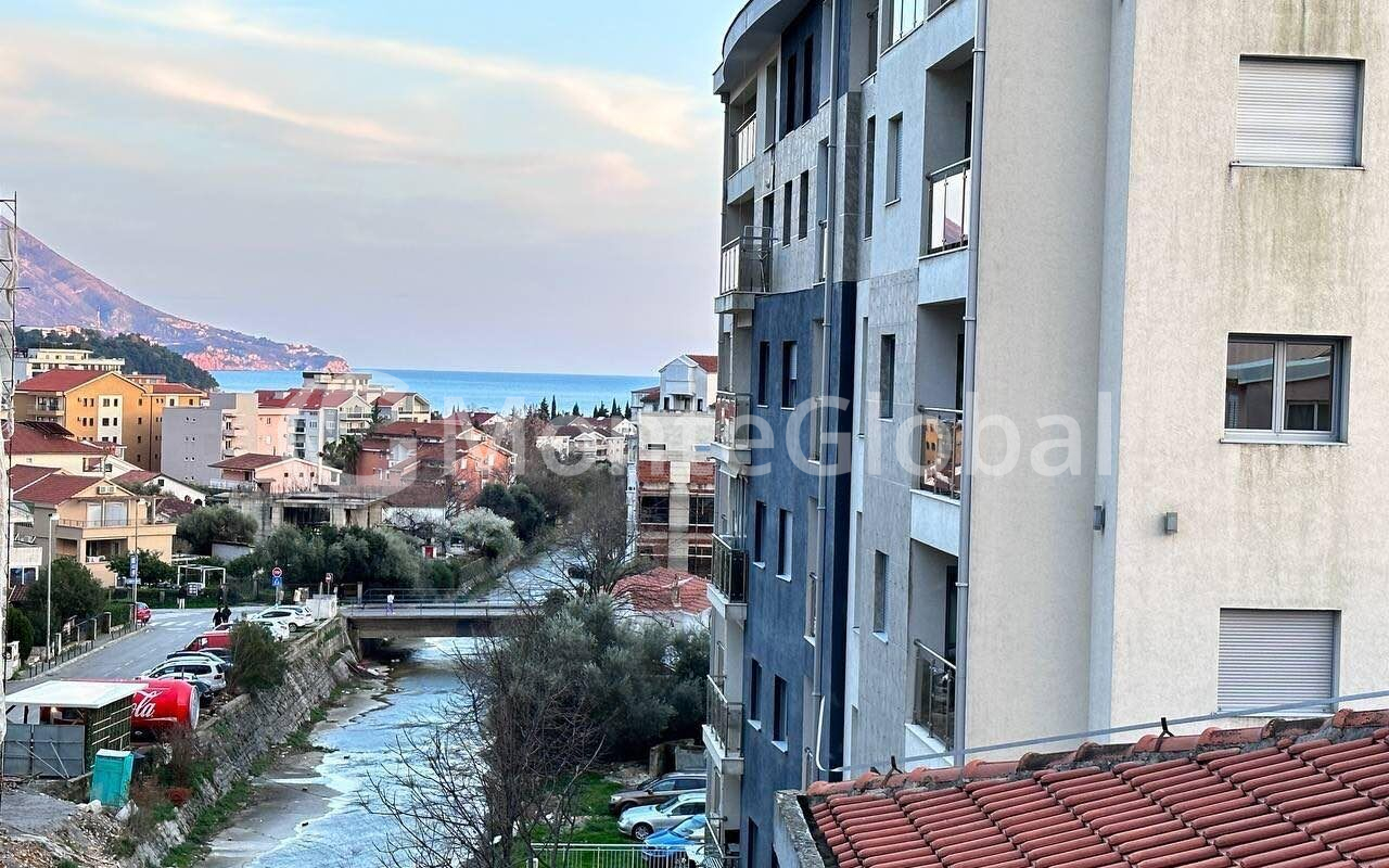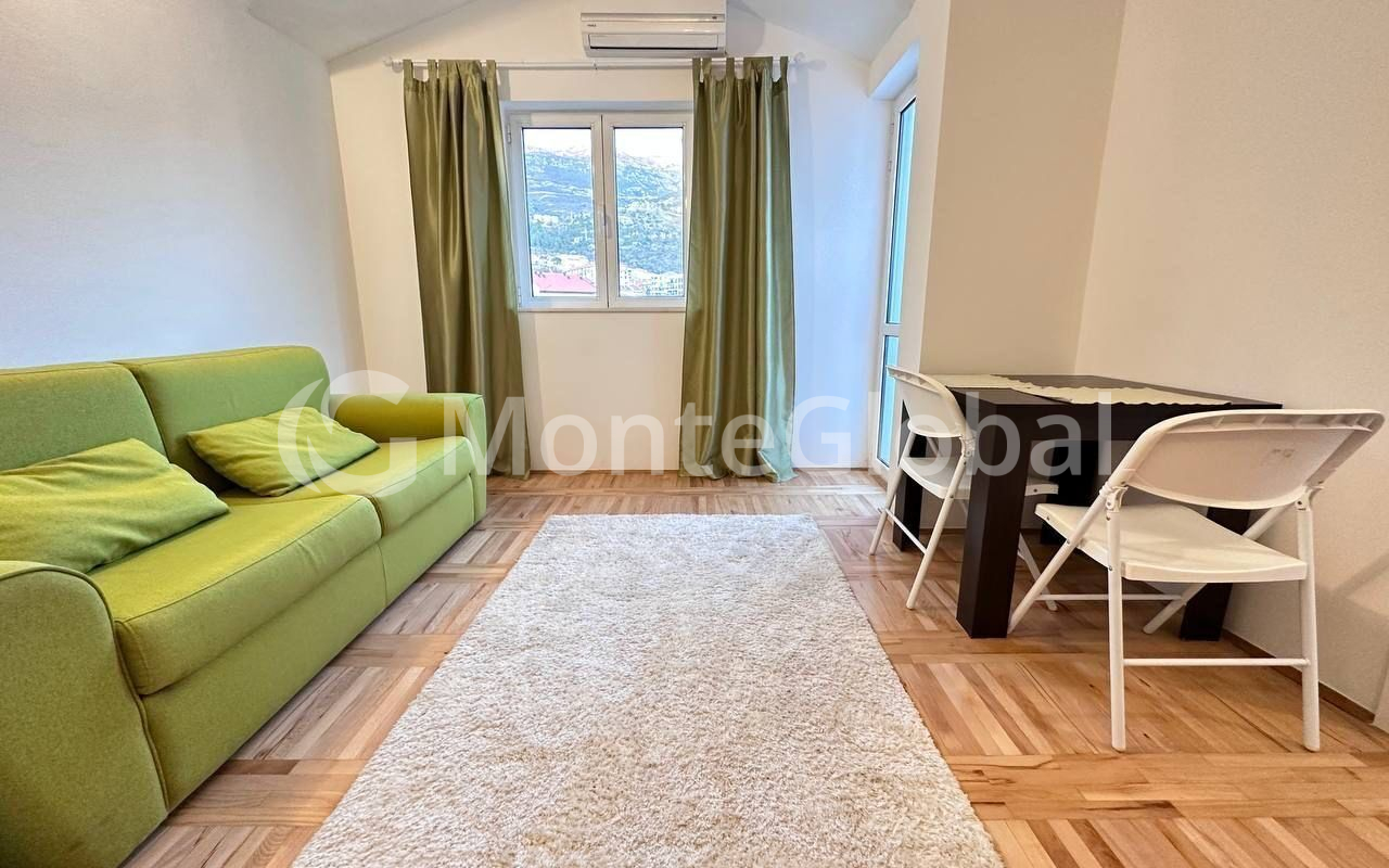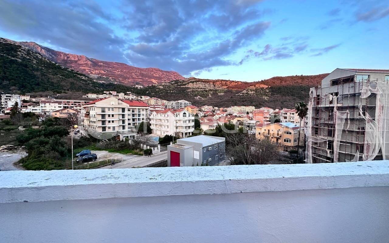 The apartment consists of a bedroom, a living room with a separate kitchen area, a bathroom with a bath and a terrace with panoramic views of Budva and the sea.