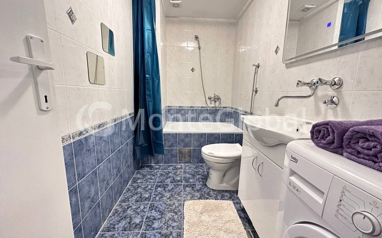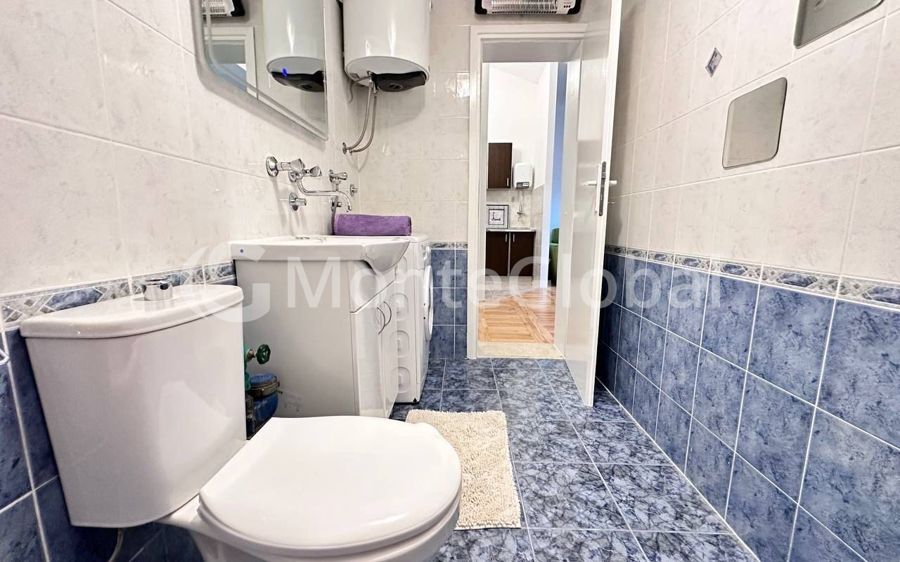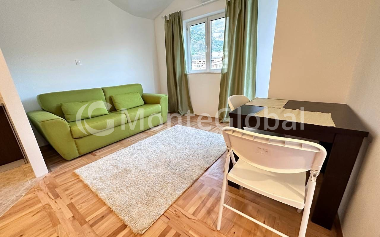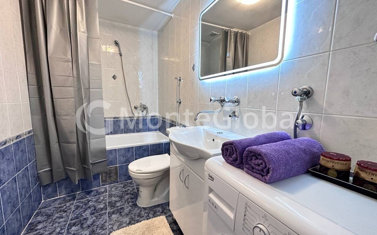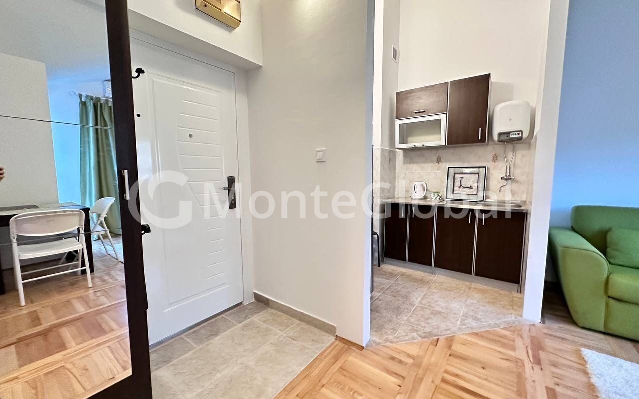The apartment consists of a bedroom, a living room with a separate kitchen area, a bathroom with a bath and a terrace with panoramic views of Budva and the sea.