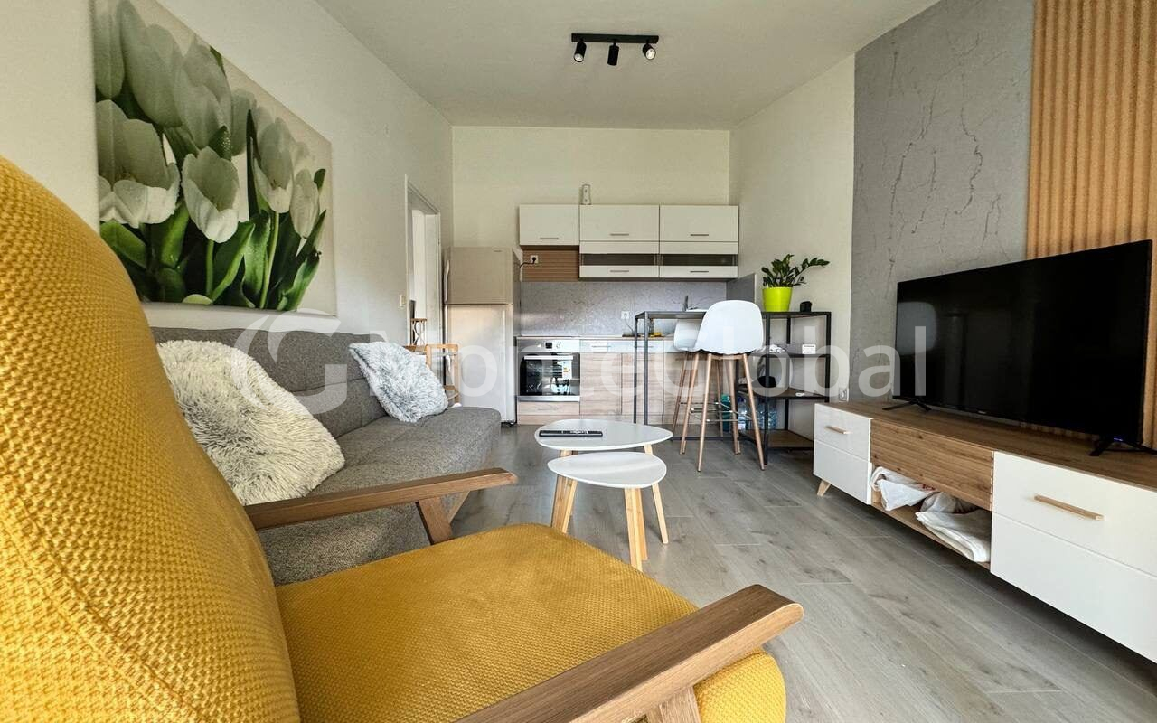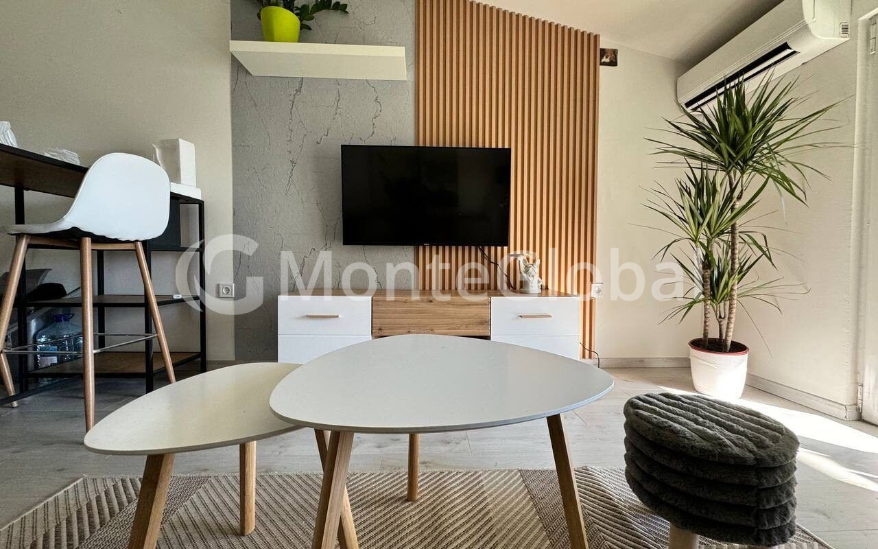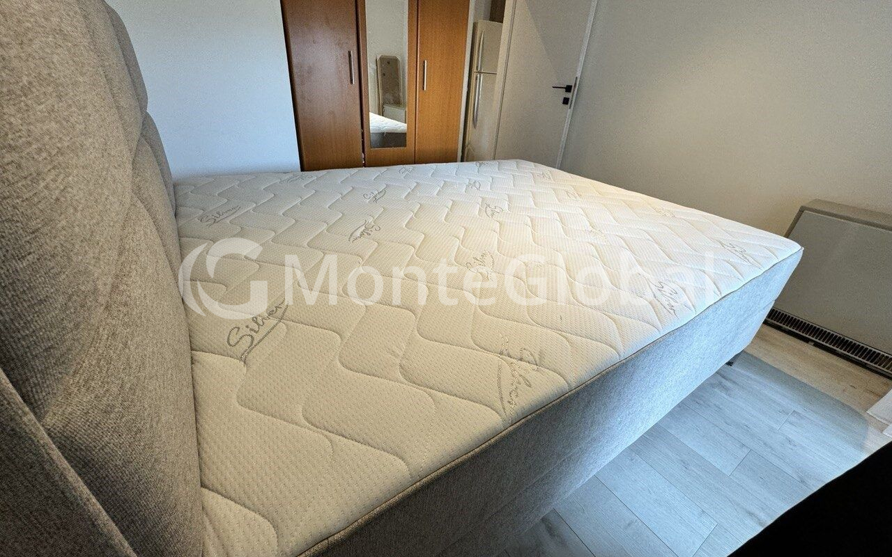 The structure of the apartment is a living room combined with a kitchen, one bedroom, a bathroom and a huge terrace