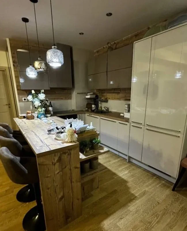 High-quality materials were used in the interior: an Austrian kitchen Dan Kuchen with a kitchen island, an Italian double bed Stylema, an Italian dining table-console and other pieces of furniture.
