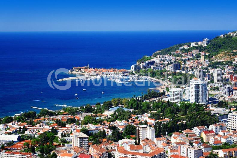 The layout includes a living room combined with a kitchen, a separate bedroom, a bathroom and a terrace with a view of the sea coast.