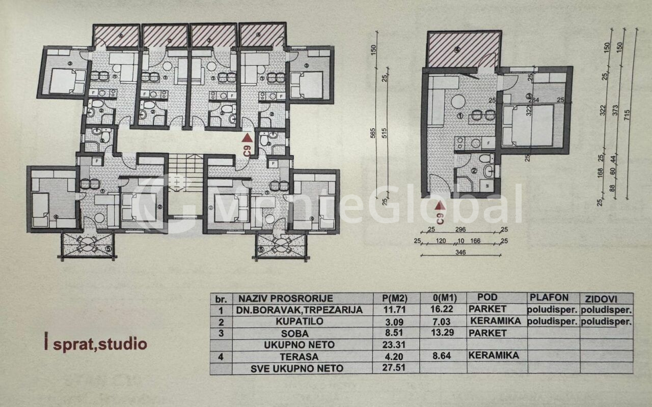 The studio is located on the ground floor of a three-story building. Its total area is 28 m². Each apartment owner is guaranteed a private parking space.