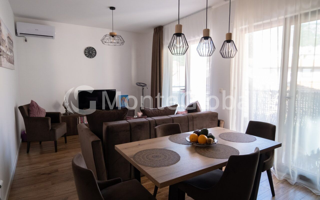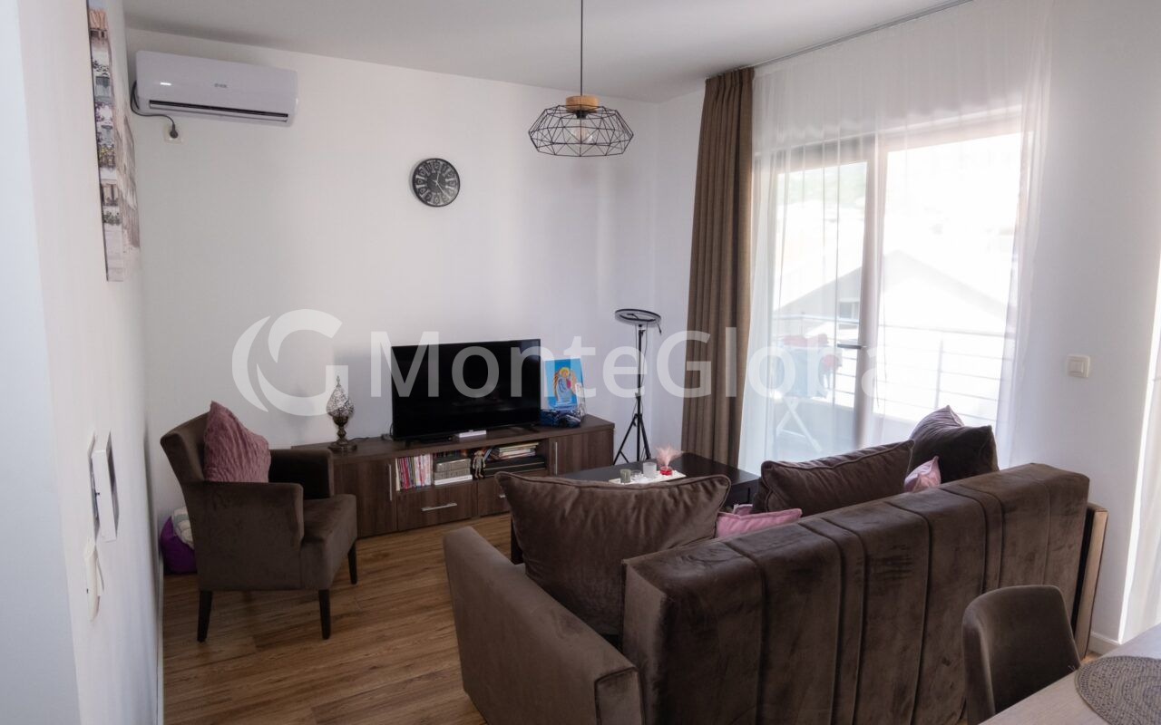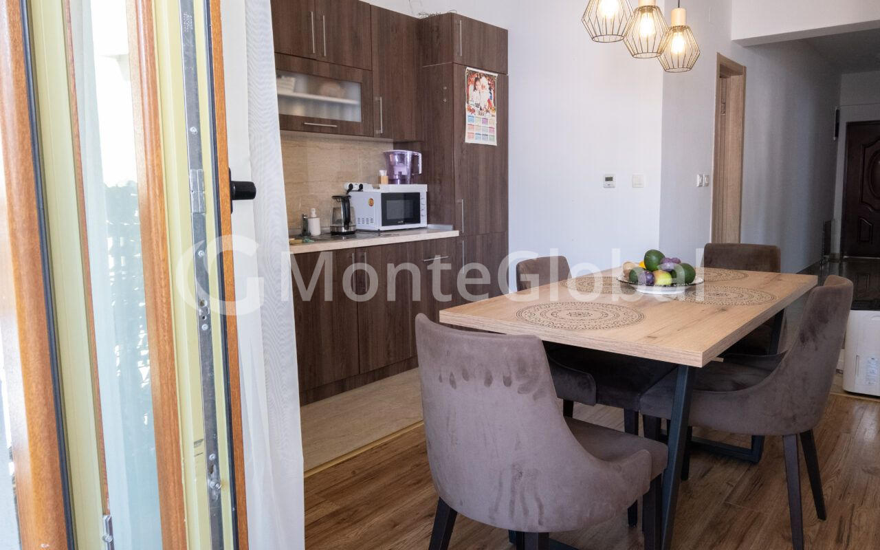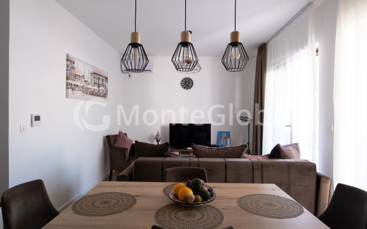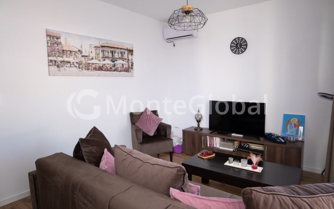 The structure of the apartment is a living room combined with a kitchen, two bedrooms, a bathroom and a terrace