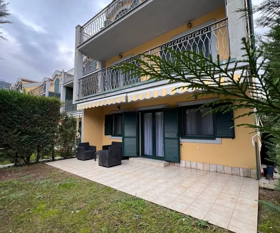 The first floor includes an entrance area, a kitchen combined with a living room, a guest bathroom, and a veranda with access to a small green garden.
