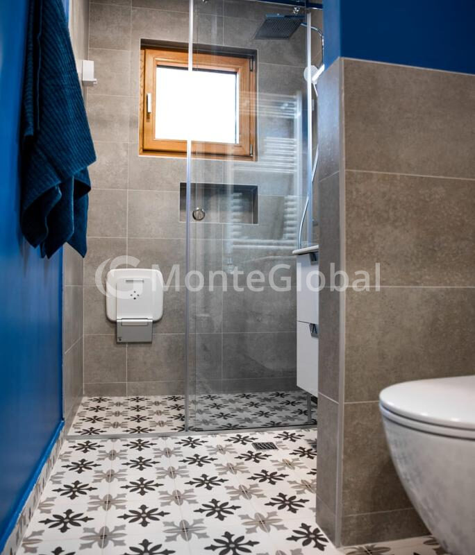 The large bedroom has a dressing room and a bathroom (bath and shower). Heated parquet floors cover the entire ground floor, including the kitchen, and the bathrooms are finished with stylish and colorful Italian tiles.