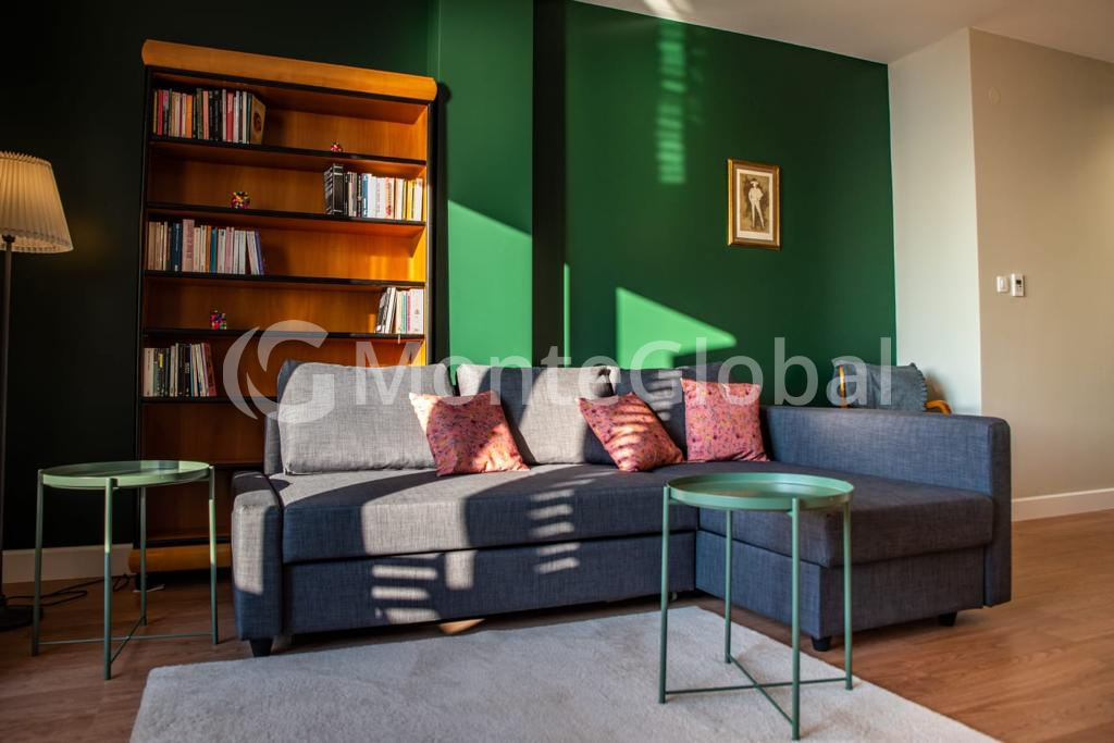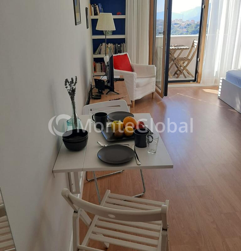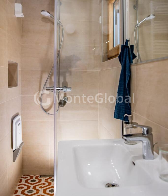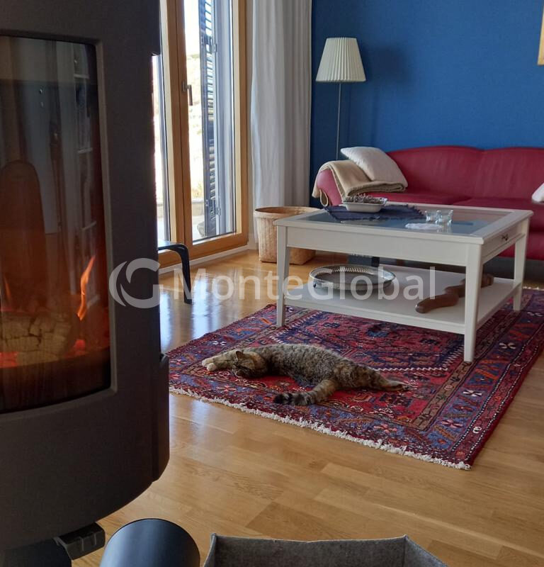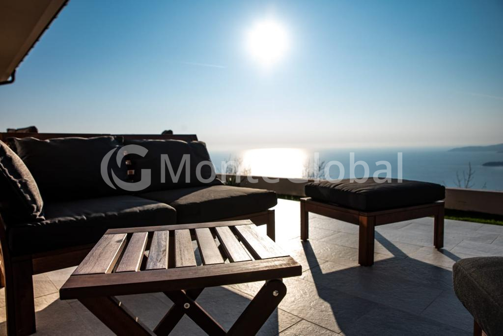 The ground floor apartment consists of a spacious open plan living room with dining area and kitchen (64m2), one bedroom and two bathrooms, a fully equipped laundry room and a storage room next to the kitchen. The living room has large French windows that face the sea and provide plenty of light, sun and stunning views. Terrace 30m2 French free-standing fireplace (Equinox Chazelles) is located in the middle of the room (8 kW), separating the living room from the dining room and kitchen. The kitchen is fully equipped and has access to the side terrace, overlooking the mountains, the rising sun and the sea.