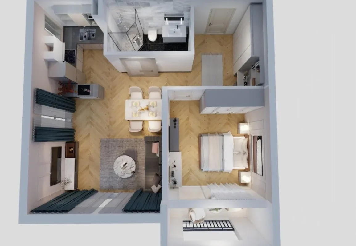 The interior includes a living room, kitchen, one bedroom, terrace and bathroom.