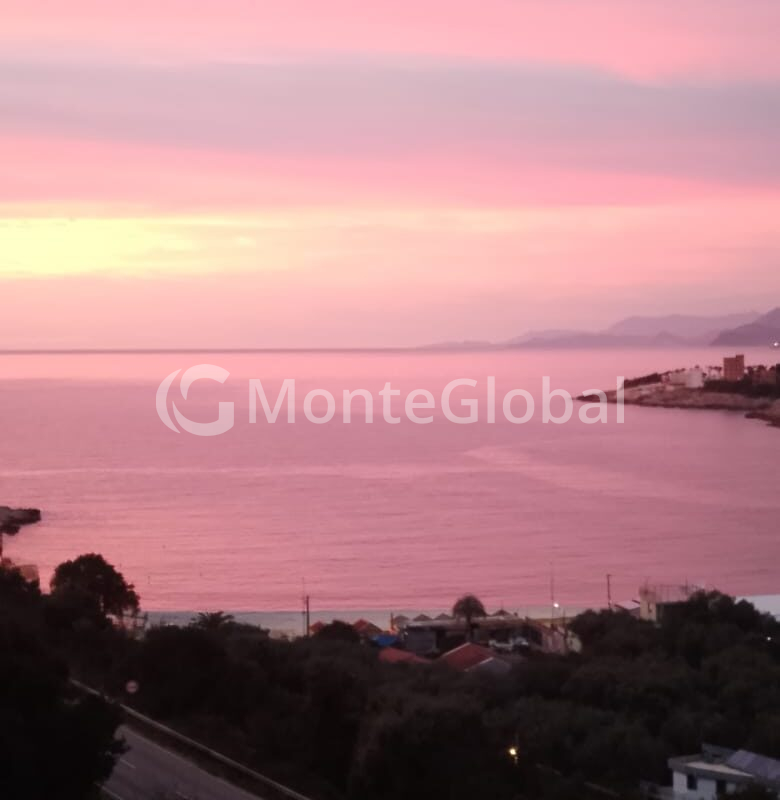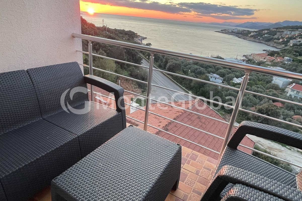 The layout includes a spacious living room combined with a kitchen area, a cozy bedroom, a bathroom and a terrace with a breathtaking view of the sea.