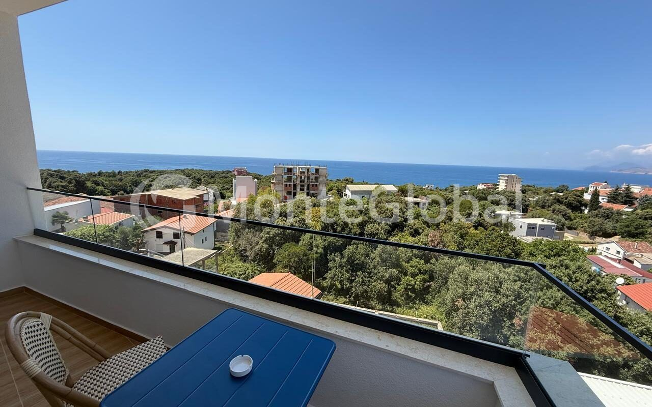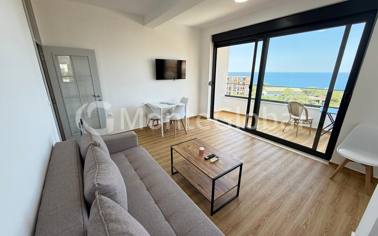 The interior space includes a combined kitchen-living room, hallway, bathroom, separate bedroom and a terrace with a panoramic view of the sea coast.