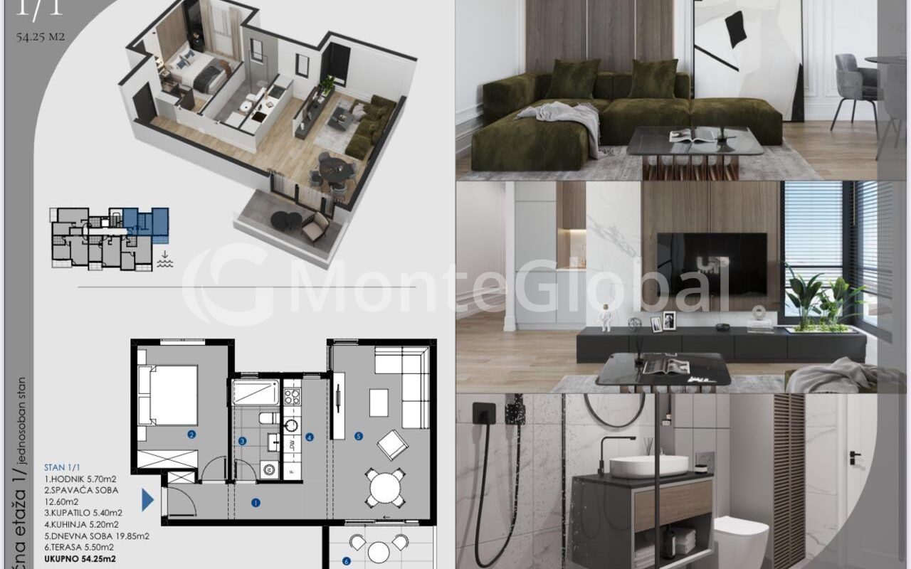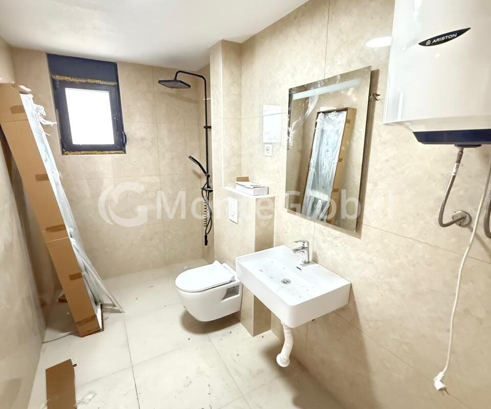 In the picturesque resort village of Dobra Voda, we offer for sale an apartment of 54 m2, where 49 m2 are allocated for living space. Located on the second floor of a seven-story building, these apartments are part of a residential complex with a 15x5 meter swimming pool, an elevator, central water supply and parking spaces.