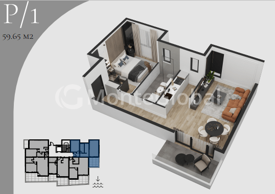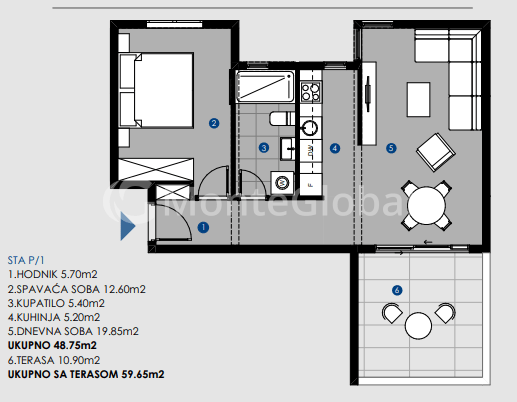 -The area of the apartment is total 59.65m2, residential area 48.75m2