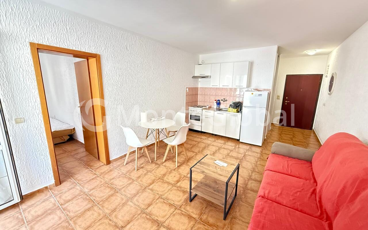 Layout: The apartment includes a living room with a kitchenette, one separate bedroom, a bathroom, and a terrace.
