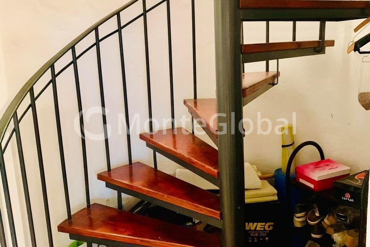 Second floor: kitchen, living room, bedroom, bathroom and balcony.