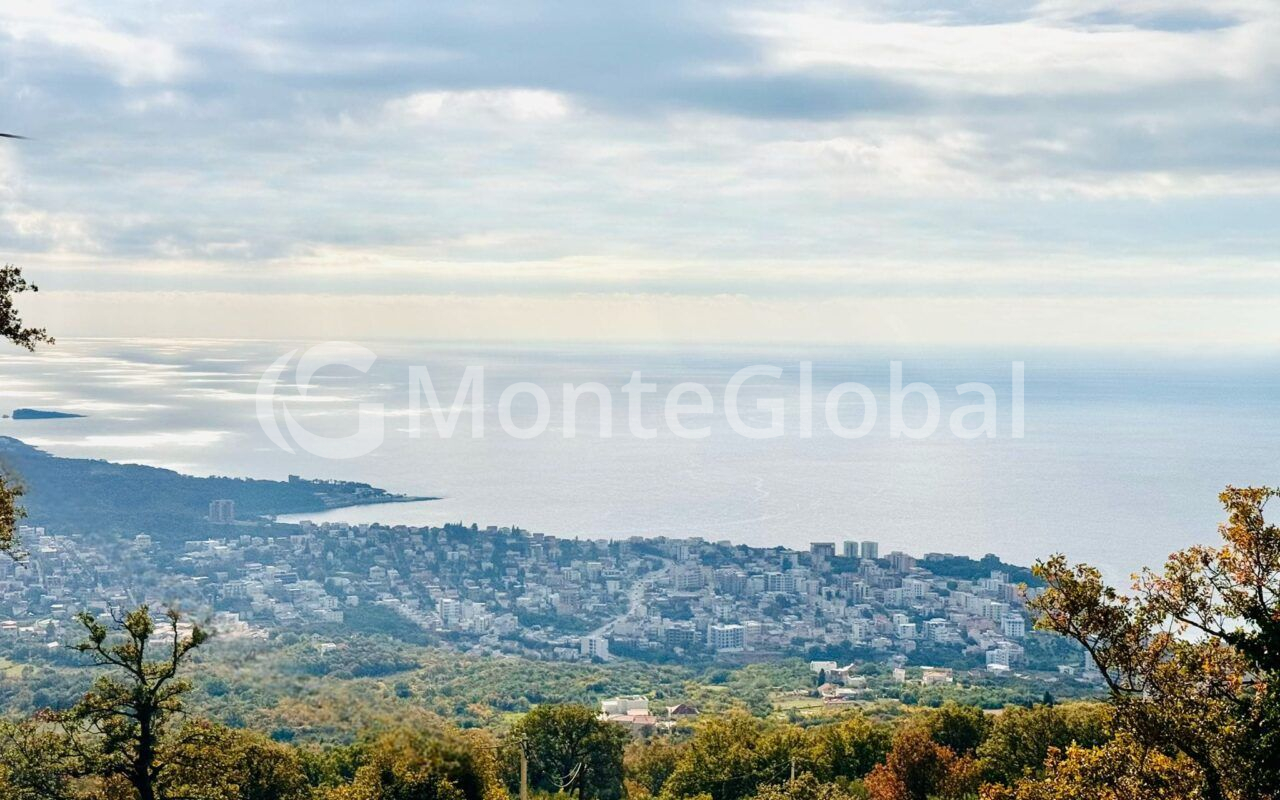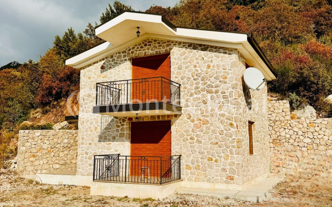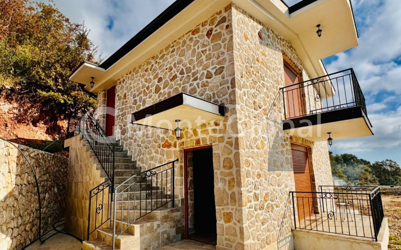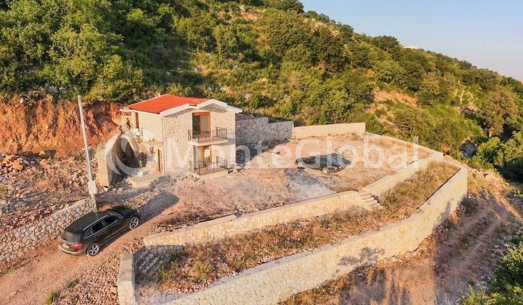 New stone house for sale in Dobra Voda with panoramic views of the sea and mountains.