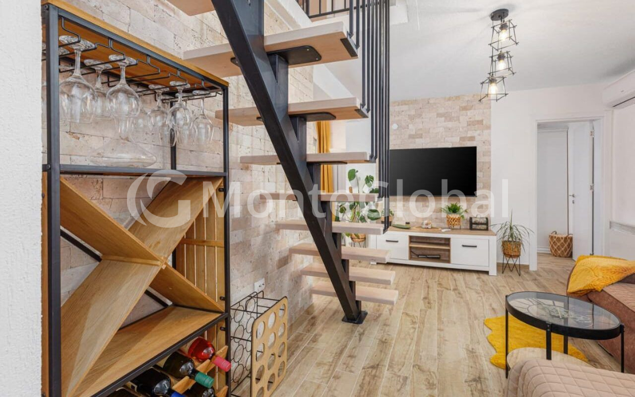 The second floor features an entrance hall, bathroom, two bedrooms, a living room, a kitchen with a dining area, and a spacious terrace. Internal staircase.
