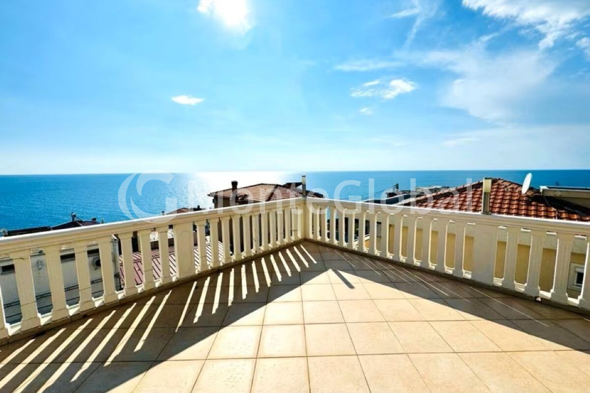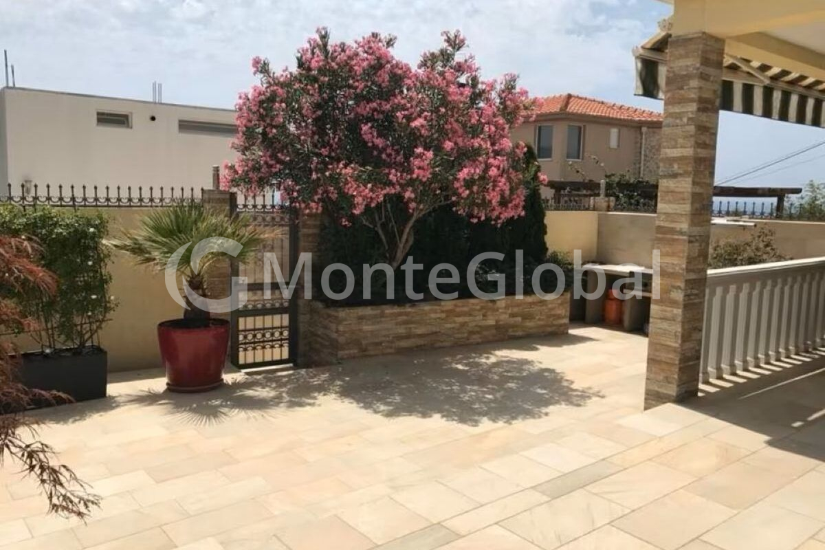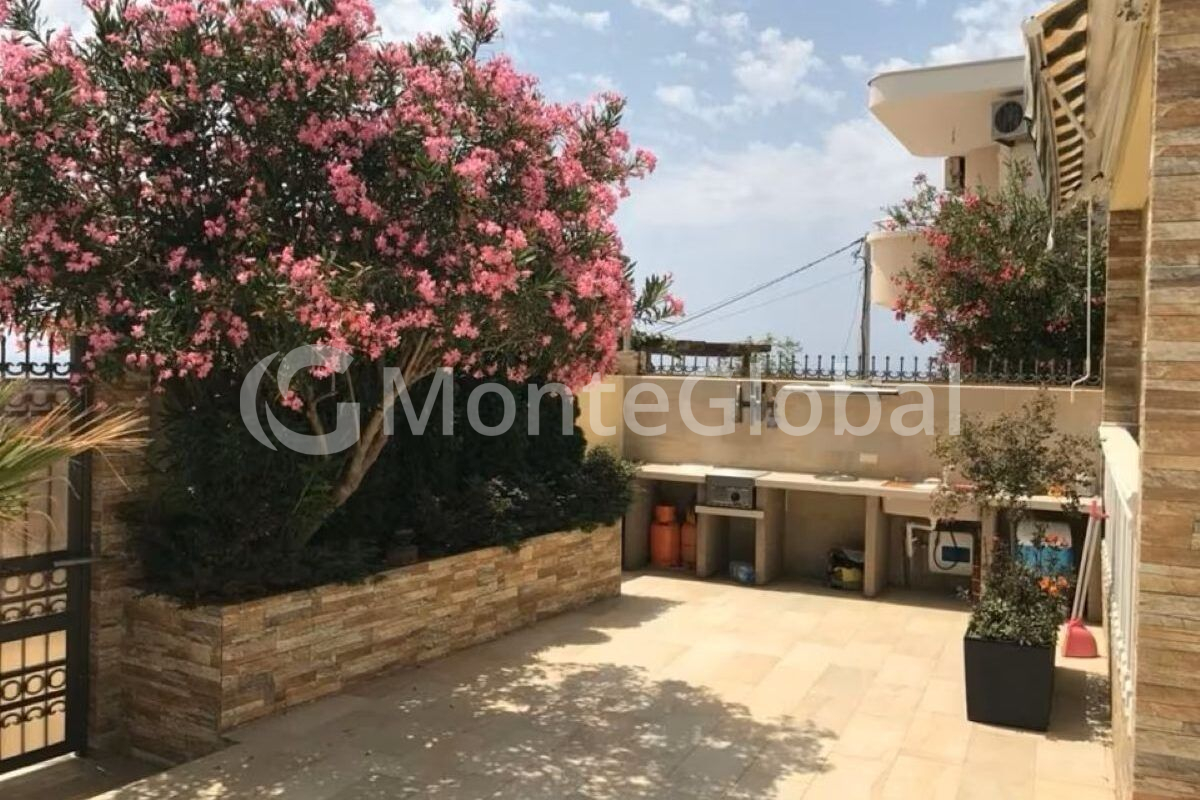 The residential building includes four bedrooms, a spacious living room with a fireplace, a kitchen area, and several terraces offering panoramic sea views. The property is fully furnished and equipped with modern appliances, ensuring immediate occupancy without any additional investment. The terraces create the perfect setting for quiet evenings and gatherings overlooking the sea horizon.
